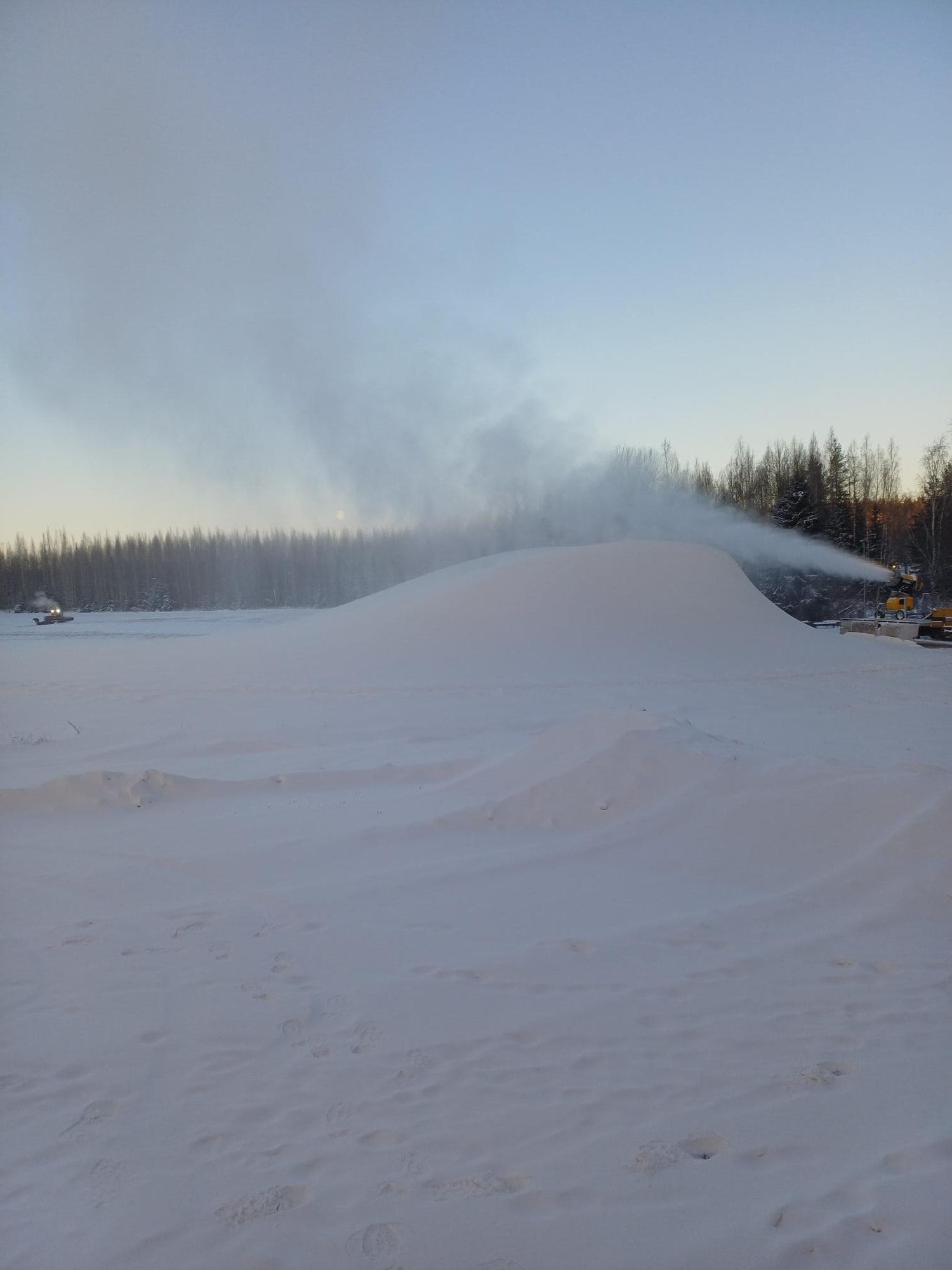 Hirvihaaran hiihtokeskuksessa on aloitettu lumen tykitys uudella tykillä Mäntsälän Urheilijoiden hiihtojaoksen talkoovoimin perjantaina 2.1.2026.