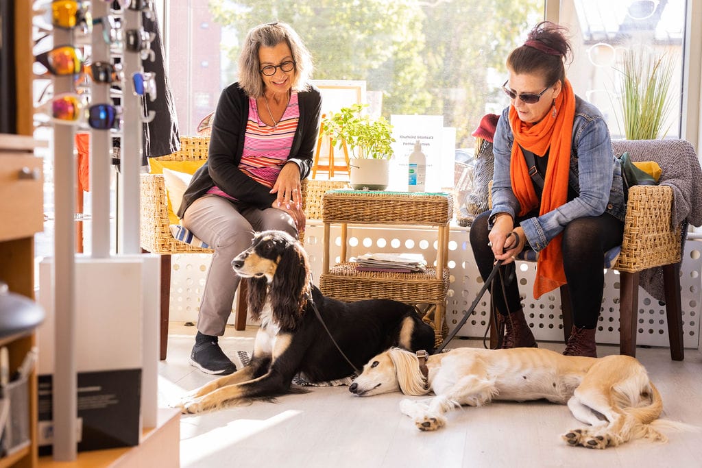 Nyt Tuulan ja hänen miehensä Lifen kotona on viisi salukia, joten puuhaa ja vilskettä riittää. Myymälässä tämän jutun kuvauksissa koirista näkee, kuka on heille kaikki kaikessa; vieraat kiinnostavat näitä ylväitä olentoja hyvin vähän. Poseeraamaan he suostuvat silti, ja saamme hienoja kuvia – silmälaseilla ja ilman.