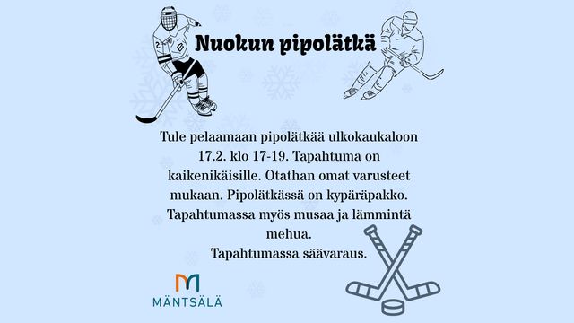 Lisätiedot toiminnasta: Kulttuuripalvelut, Tarja Kuusela (ohje: etunimi.sukunimi@mantsala.fi)