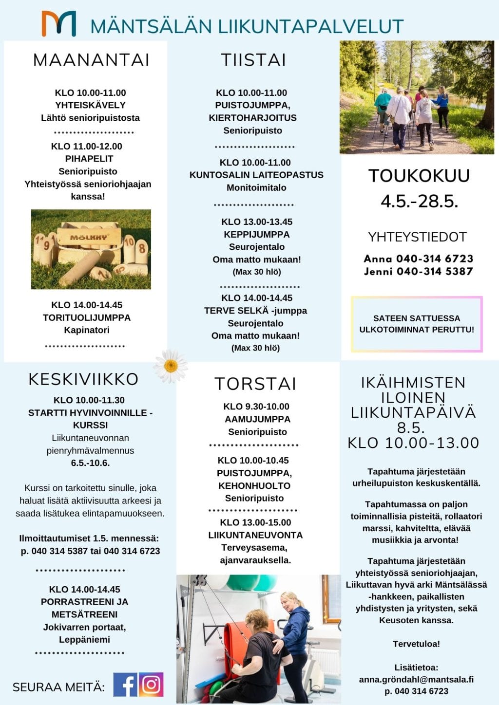 Kesän liikuntaryhmät käynnistyvät maanantaina 4.5.2026. Kesäkauden ohjatut ryhmät ovat kaikille avoimia ja maksuttomia. Liikuntaryhmiin ei tarvitse ilmoittautua. Kesäkuukaudet sisältävät hieman erilaiset ohjelmat, alla toukokuun, kesäkuun ja elokuun ohjelmat.